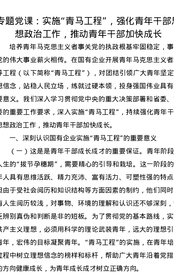专题党课:实施“青马工程”,强化青年干部思想政治工作,推动青年干部加快成长