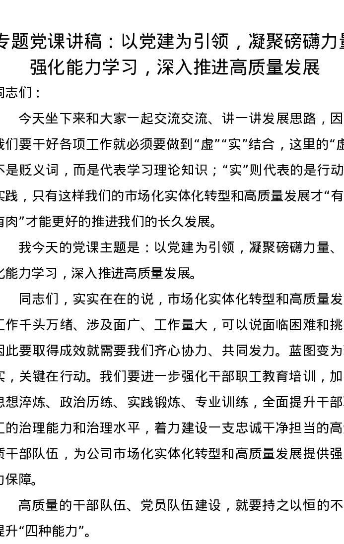 专题党课讲稿:以党建为引领,凝聚磅礴力量、强化能力学习,深入推进高质量发展