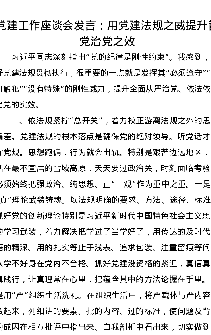 党建工作座谈会发言:用党建法规之威提升管党治党之效