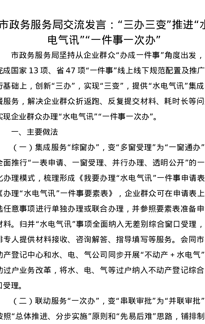 市政务服务局交流发言:“三办三变”推进“水电气讯”“一件事一次办”
