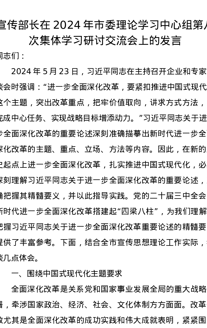 宣传部长在2024年市委理论学习中心组第八次集体学习研讨交流会上的发言