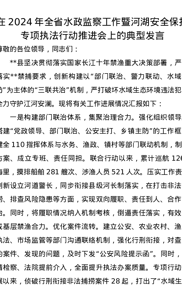 在2024年全省水政监察工作暨河湖安全保护专项执法行动推进会上的典型发言