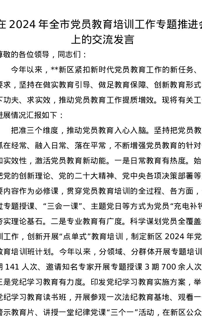 在2024年全市党员教育培训工作专题推进会上的交流发言