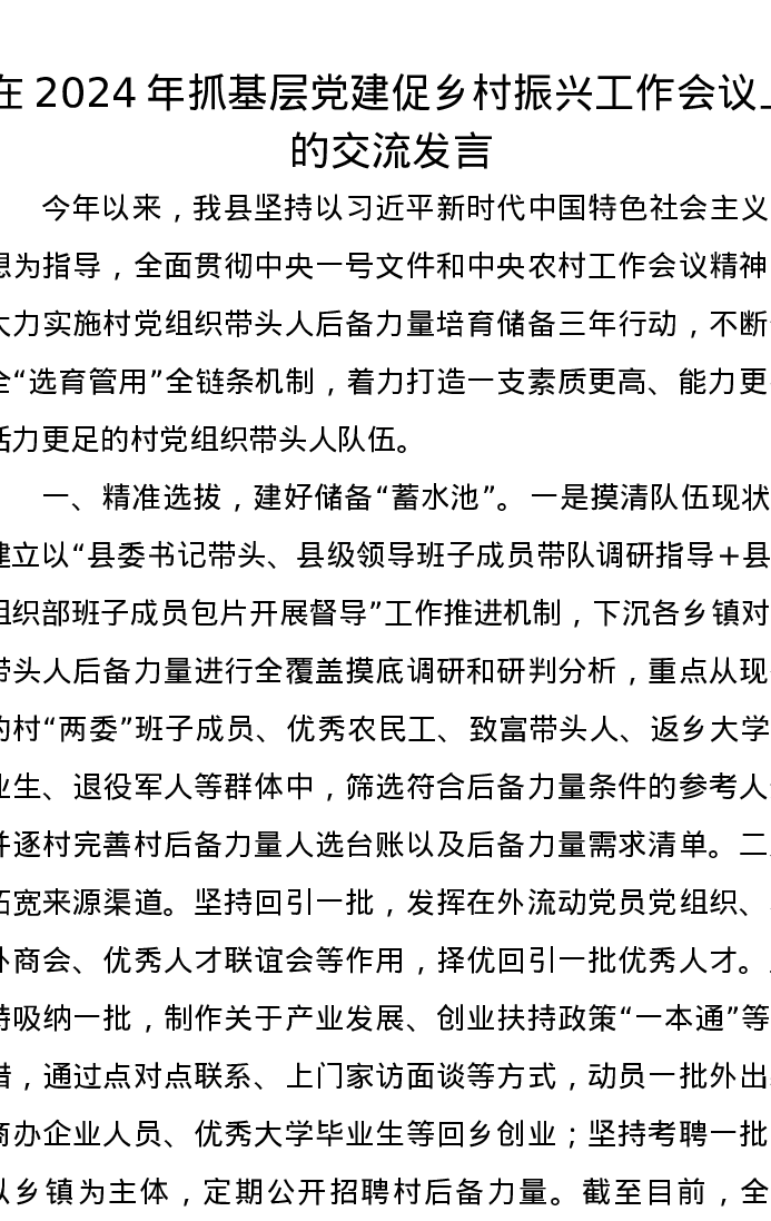 在2024年抓基层党建促乡村振兴工作会议上的交流发言