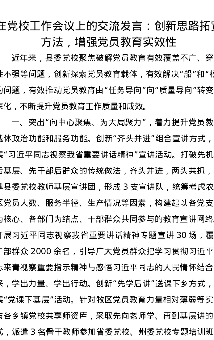 在党校工作会议上的交流发言:创新思路拓宽方法,增强党员教育实效性
