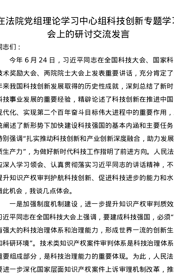 在法院党组理论学习中心组科技创新专题学习会上的研讨交流发言