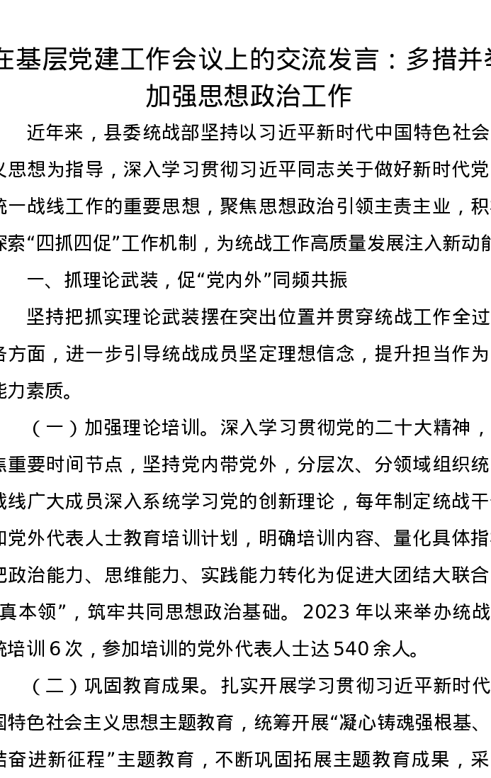 在基层党建工作会议上的交流发言:多措并举加强思想政治工作