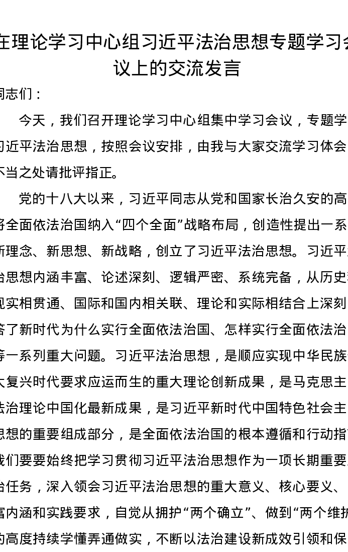 在理论学习中心组习近平法治思想专题学习会议上的交流发言