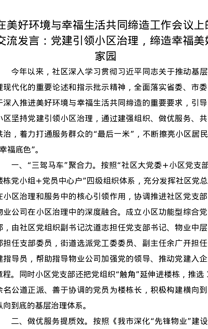 在美好环境与幸福生活共同缔造工作会议上的交流发言:党建引领小区治理,缔造幸福美好家园
