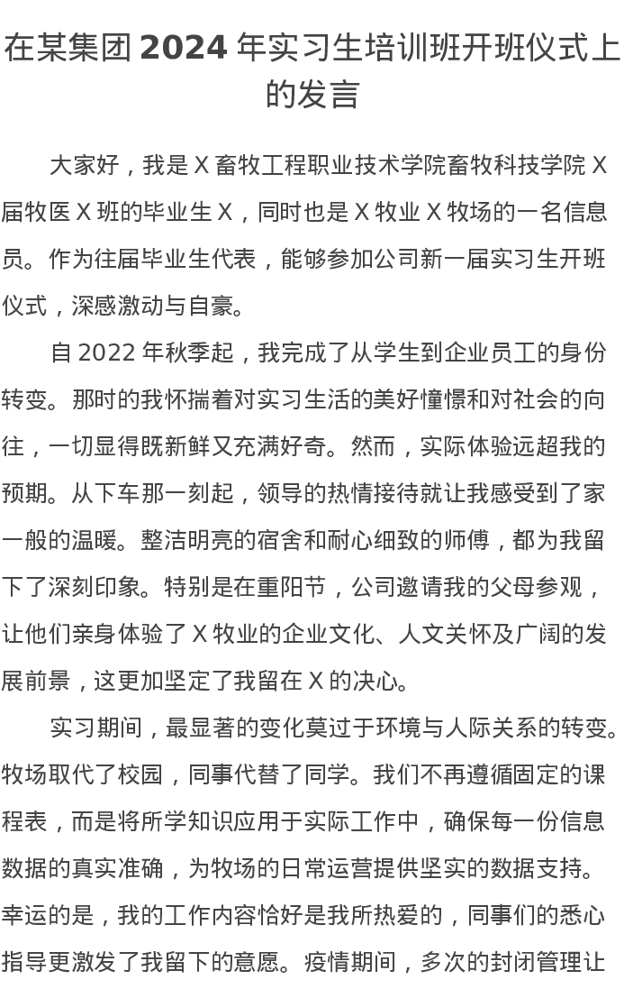 在某集团2024年实习生培训班开班仪式上的发言