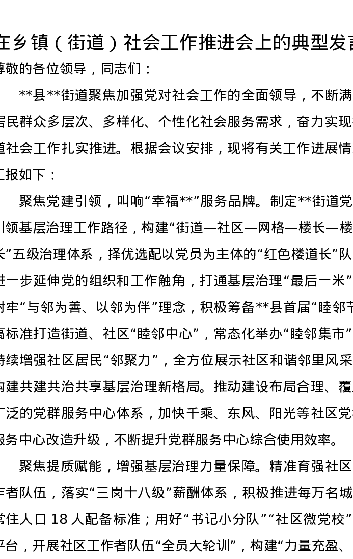 在乡镇(街道)社会工作推进会上的典型发言