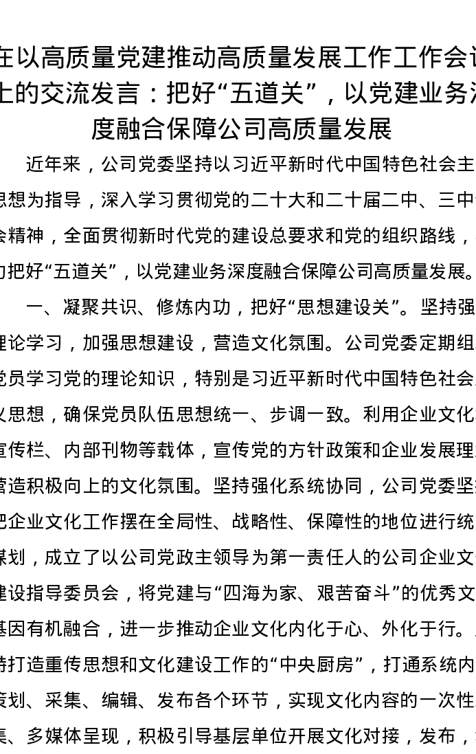 在以高质量党建推动高质量发展工作工作会议上的交流发言:把好“五道关”,以党建业务深度融合保障公司高质量发展