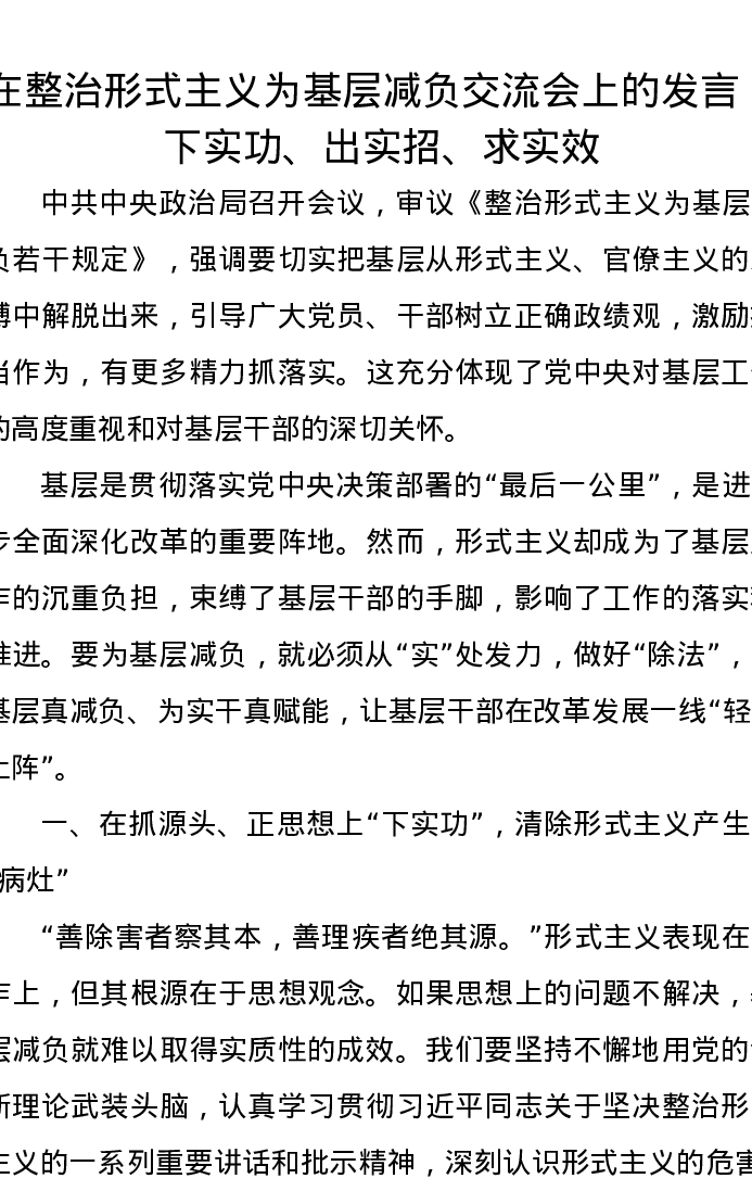 在整治形式主义为基层减负交流会上的发言:下实功、出实招、求实效