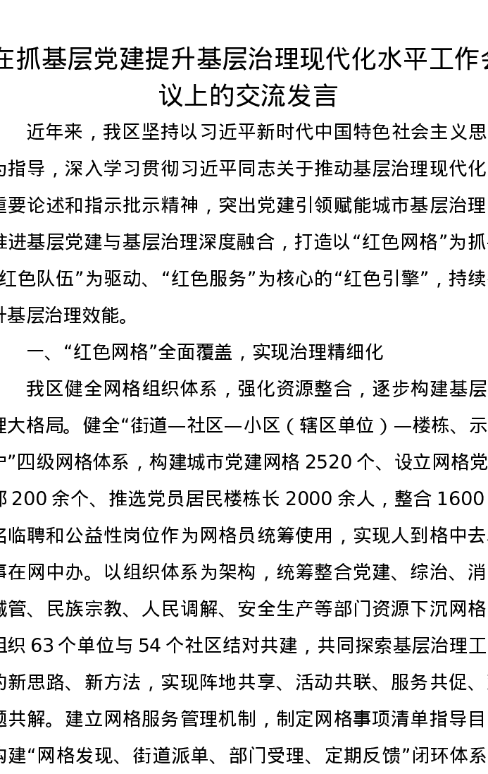 在抓基层党建提升基层治理现代化水平工作会议上的交流发言