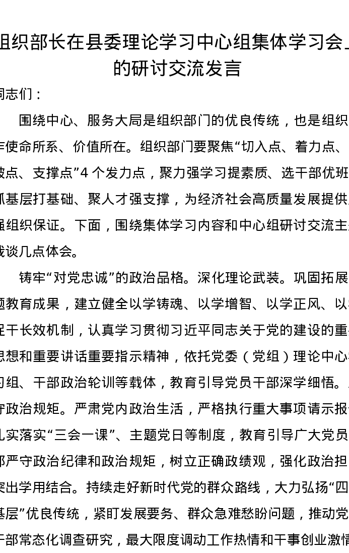 组织部长在县委理论学习中心组集体学习会上的研讨交流发言