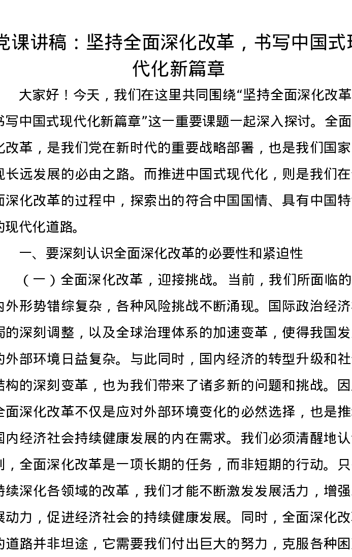 党课讲稿:坚持全面深化改革,书写中国式现代化新篇章