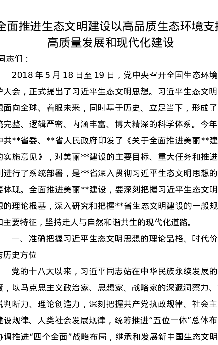 党课讲稿:全面推进生态文明建设以高品质生态环境支撑高质量发展和现代化建设