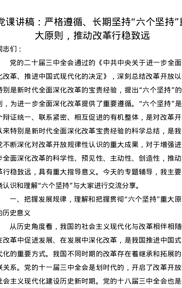党课讲稿:严格遵循、长期坚持“六个坚持”重大原则,推动改革行稳致远