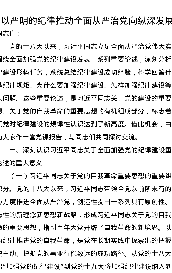 党课讲稿:以严明的纪律推动全面从严治党向纵深发展