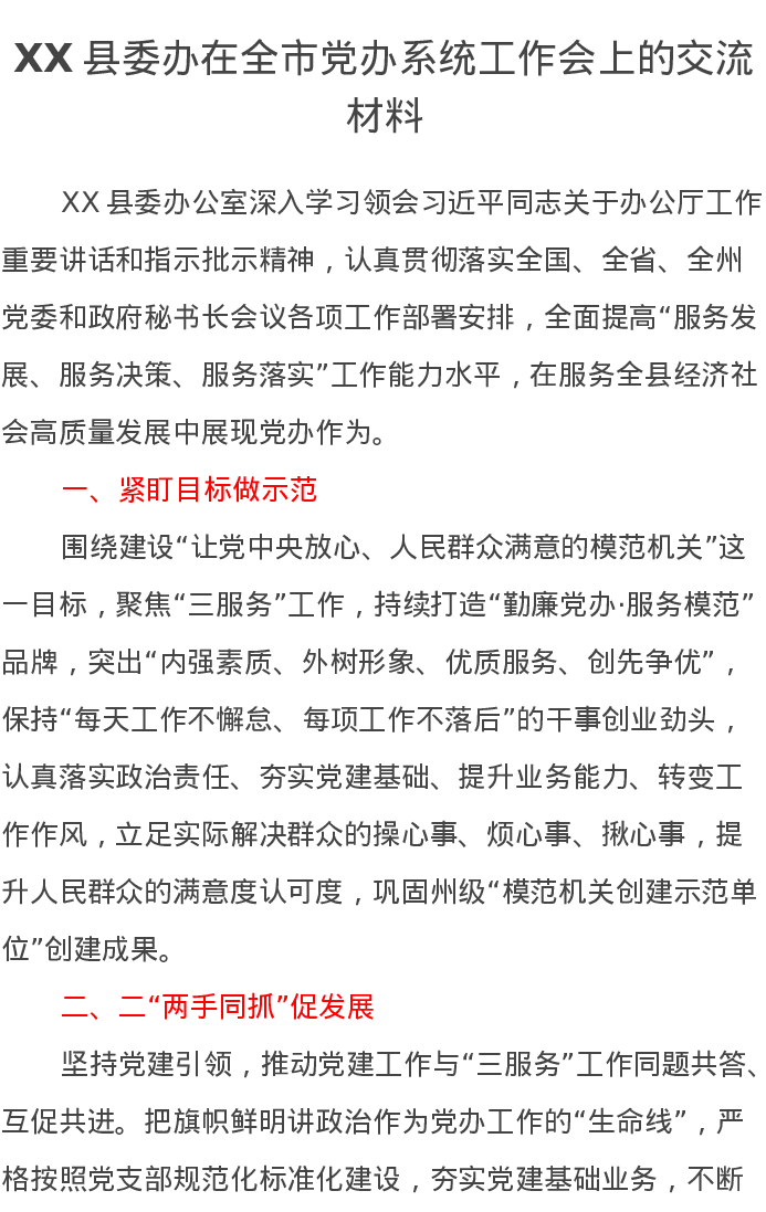 XX县委办在全市党办系统工作会上的交流发言材料