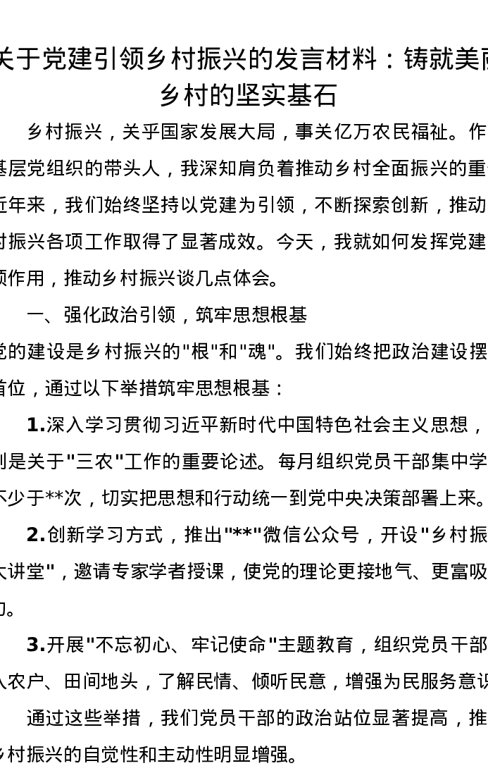关于党建引领乡村振兴的发言材料:铸就美丽乡村的坚实基石