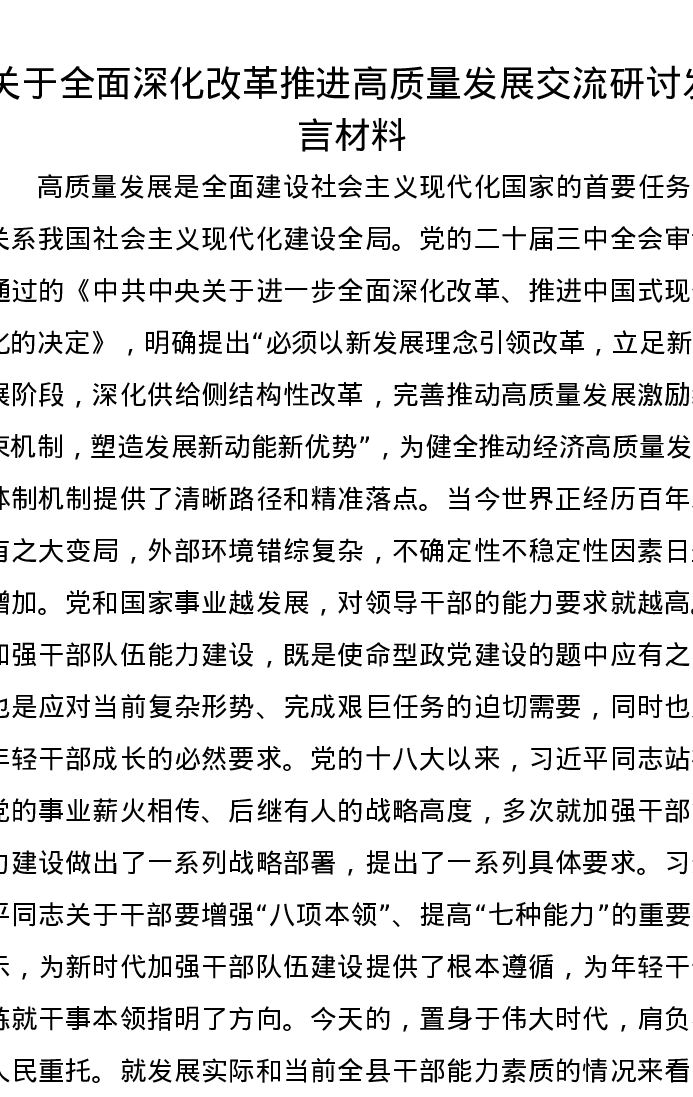 关于全面深化改革推进高质量发展交流研讨发言材料