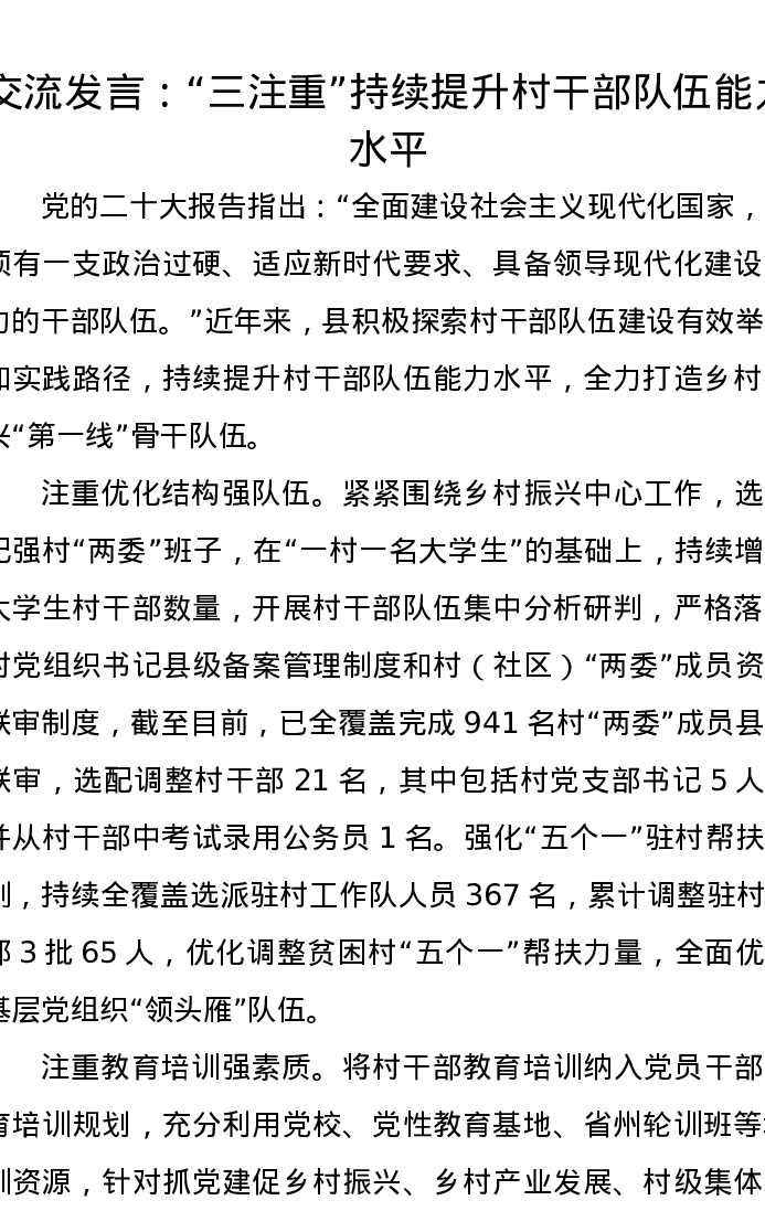 交流发言:“三注重”持续提升村干部队伍能力水平