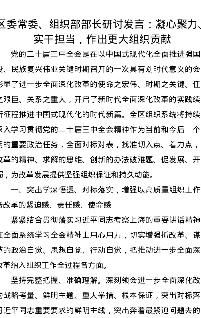 区委常委、组织部部长研讨发言:凝心聚力、实干担当,作出更大组织贡献