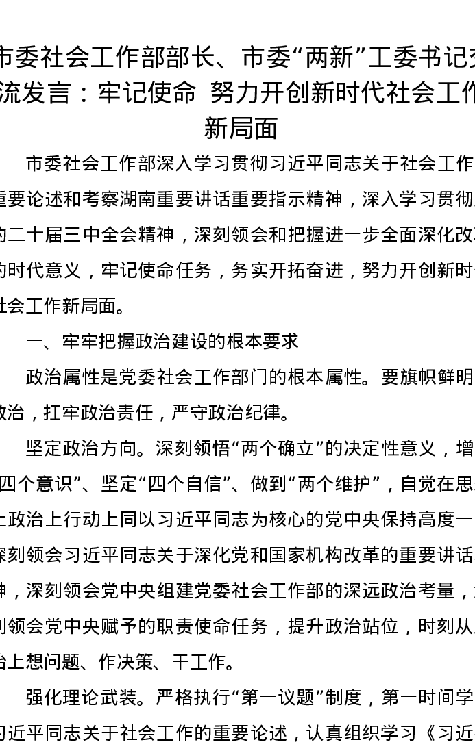 市委社会工作部部长、市委“两新”工委书记交流发言:牢记使命,努力开创新时代社会工作新局面