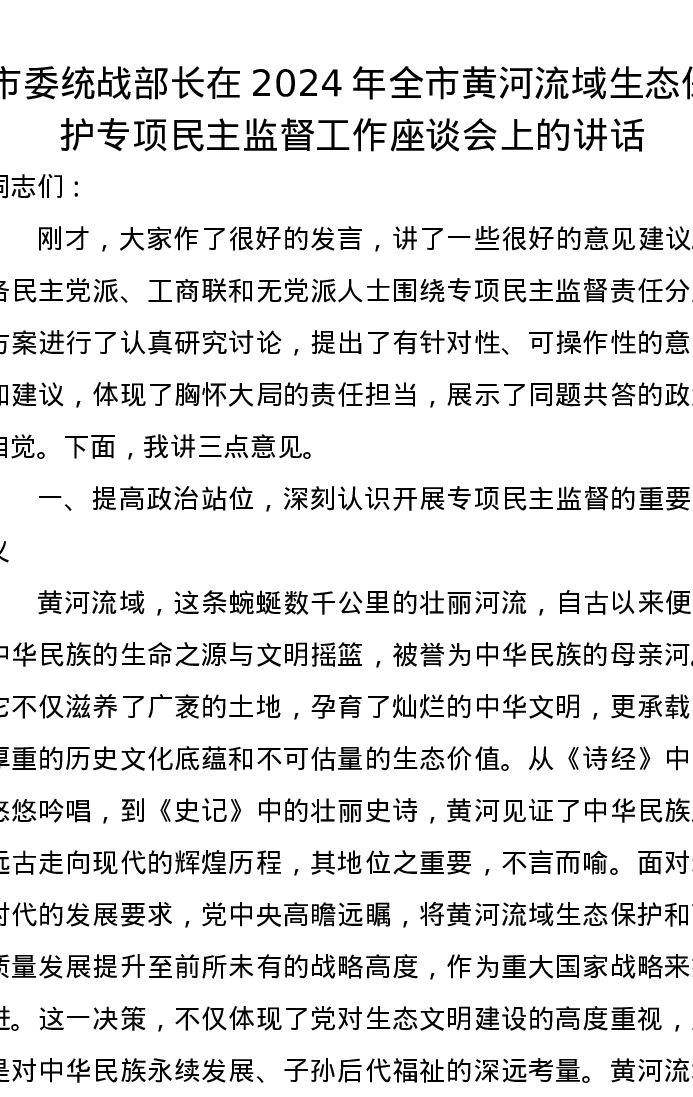市委统战部长在2024年全市黄河流域生态保护专项民主监督工作座谈会上的讲话