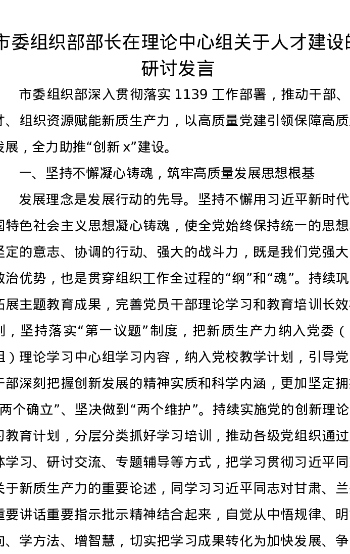 市委组织部部长在理论中心组关于人才建设的研讨发言