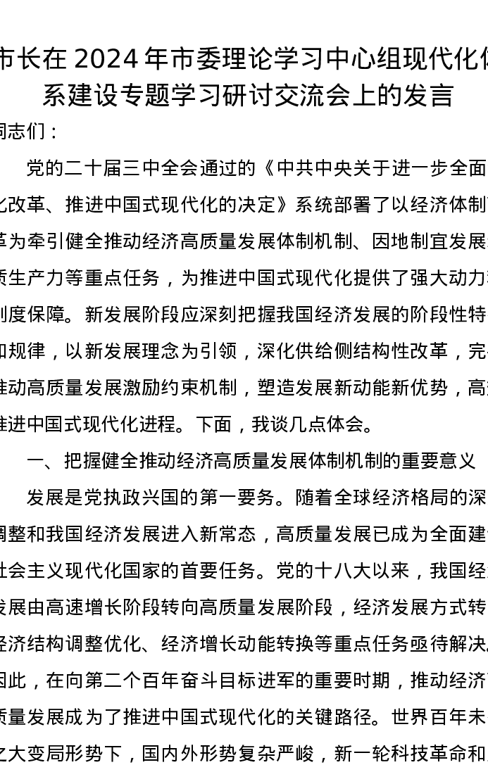 市长在2024年市委理论学习中心组现代化体系建设专题学习研讨交流会上的发言