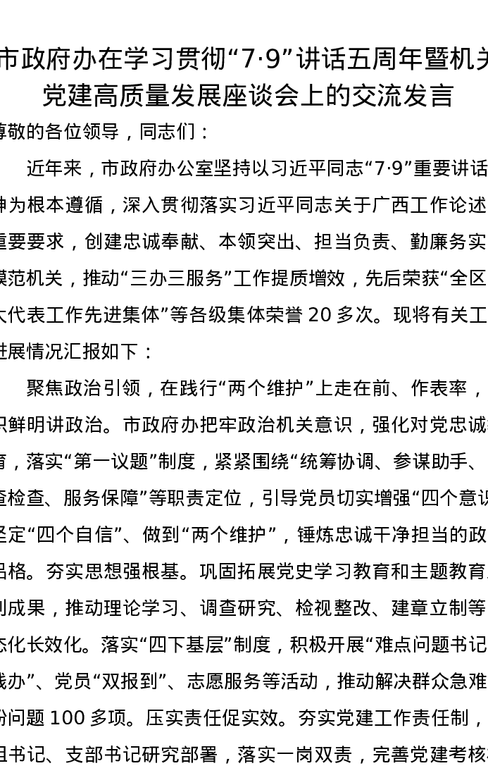市政府办在学习贯彻“7·9”讲话五周年暨机关党建高质量发展座谈会上的交流发言