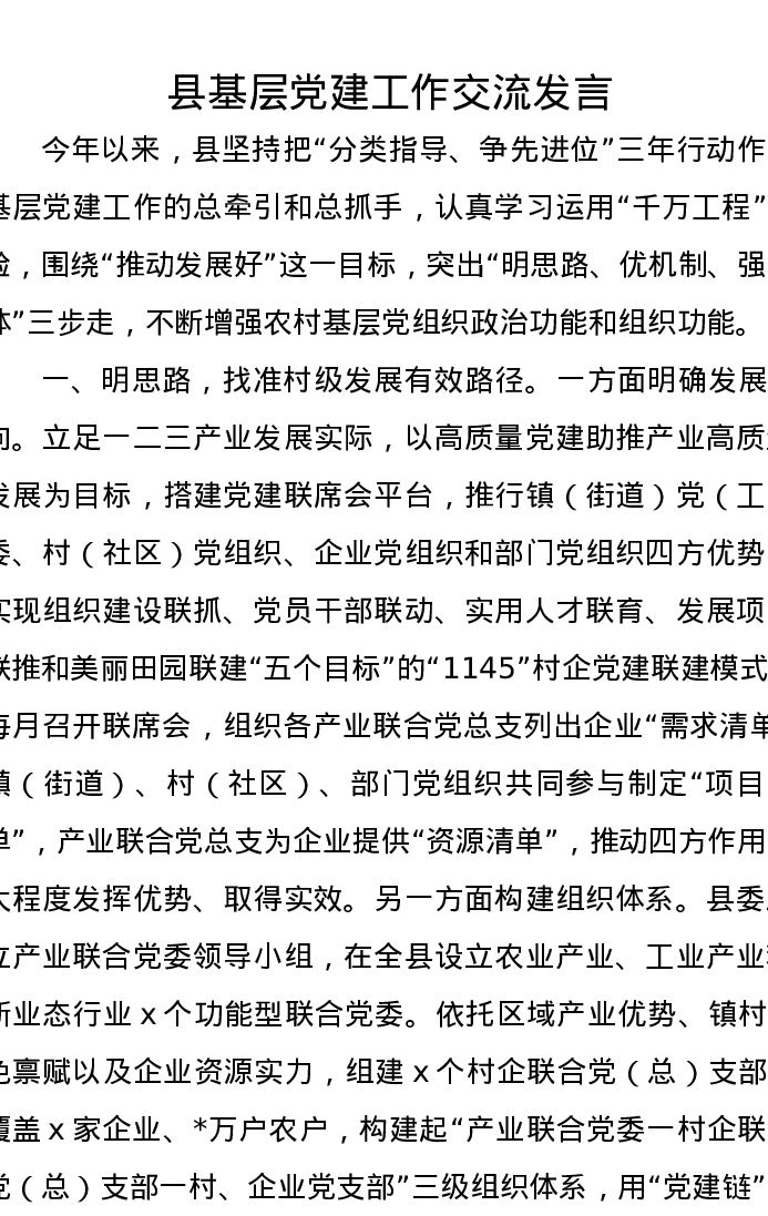 县基层党建工作交流发言