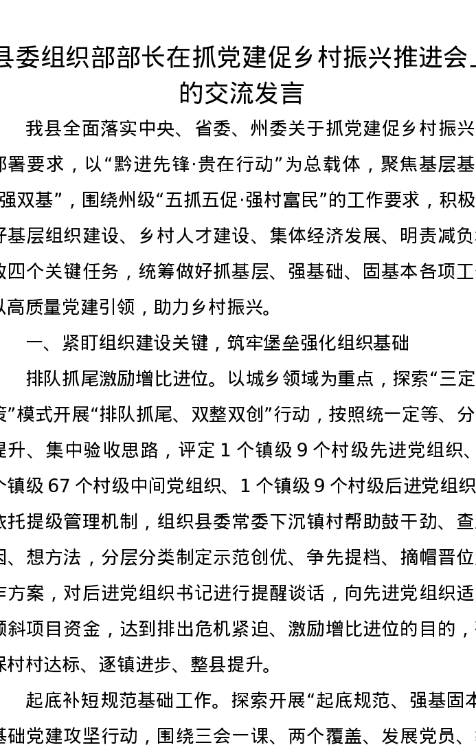 县委组织部部长在抓党建促乡村振兴推进会上的交流发言