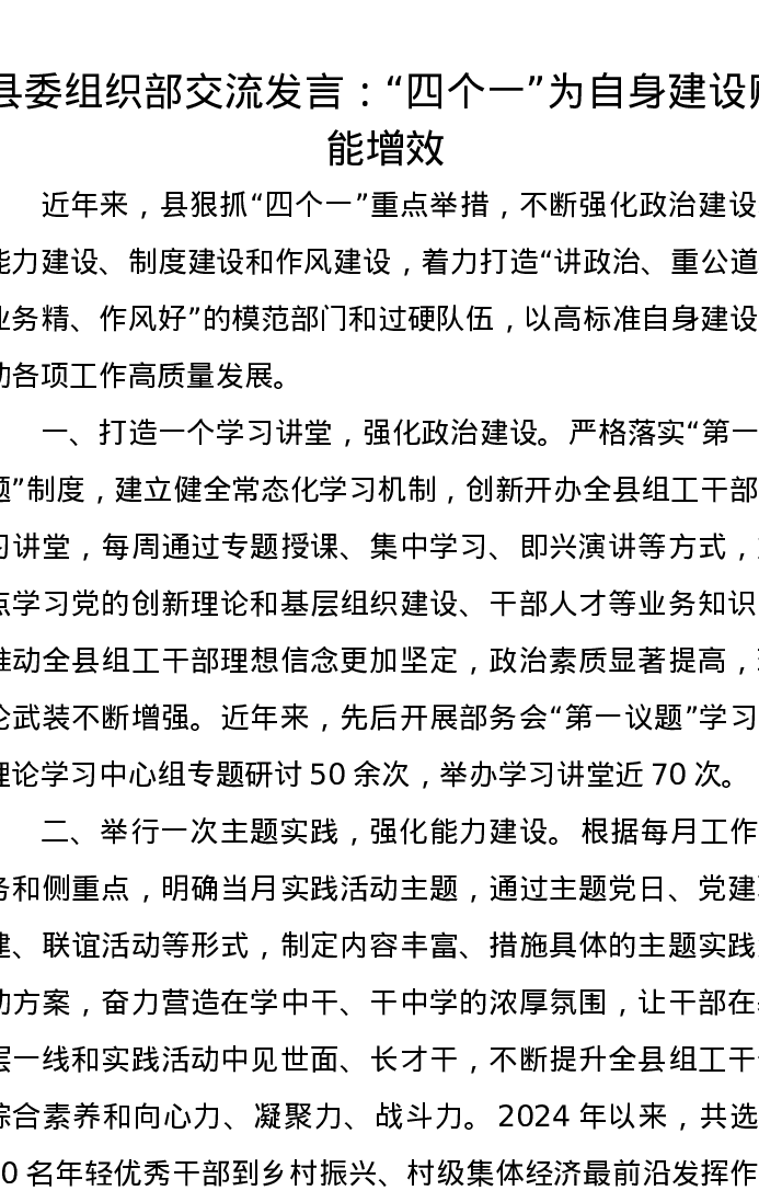 县委组织部交流发言:“四个一”为自身建设赋能增效