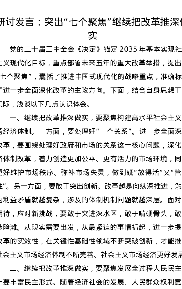 研讨发言:突出“七个聚焦”继续把改革推深做实
