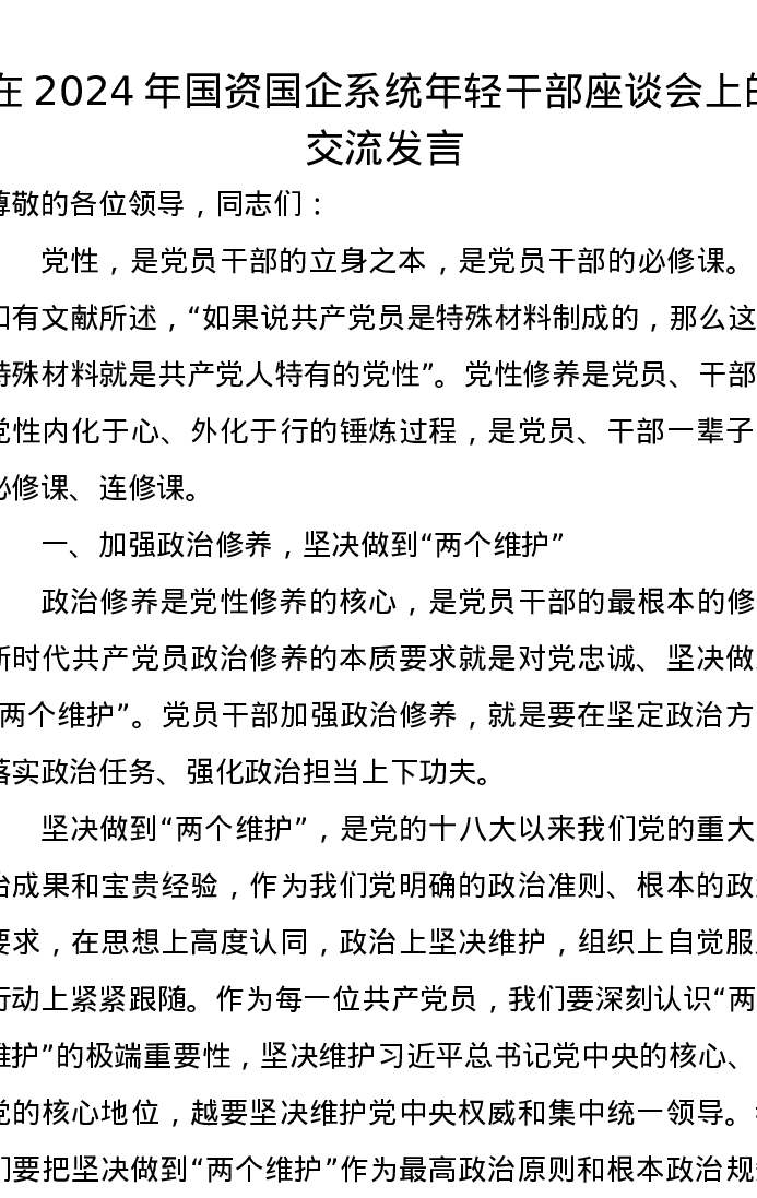 在2024年国资国企系统年轻干部座谈会上的交流发言