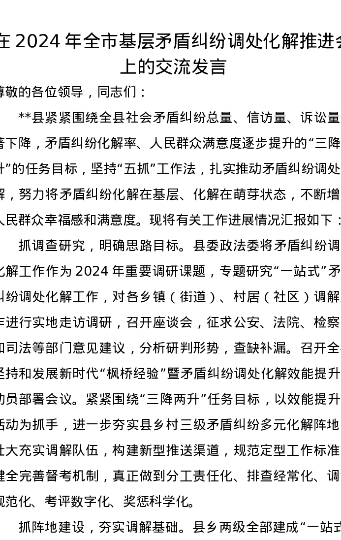 在2024年全市基层矛盾纠纷调处化解推进会上的交流发言