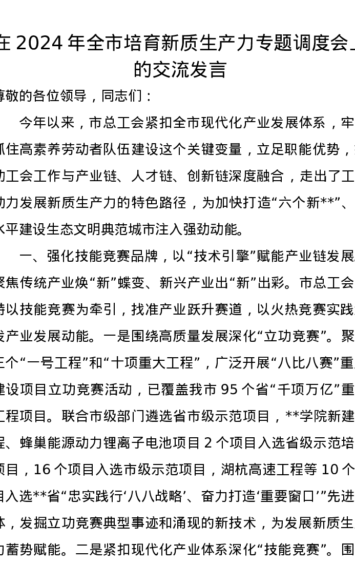 在2024年全市培育新质生产力专题调度会上的交流发言