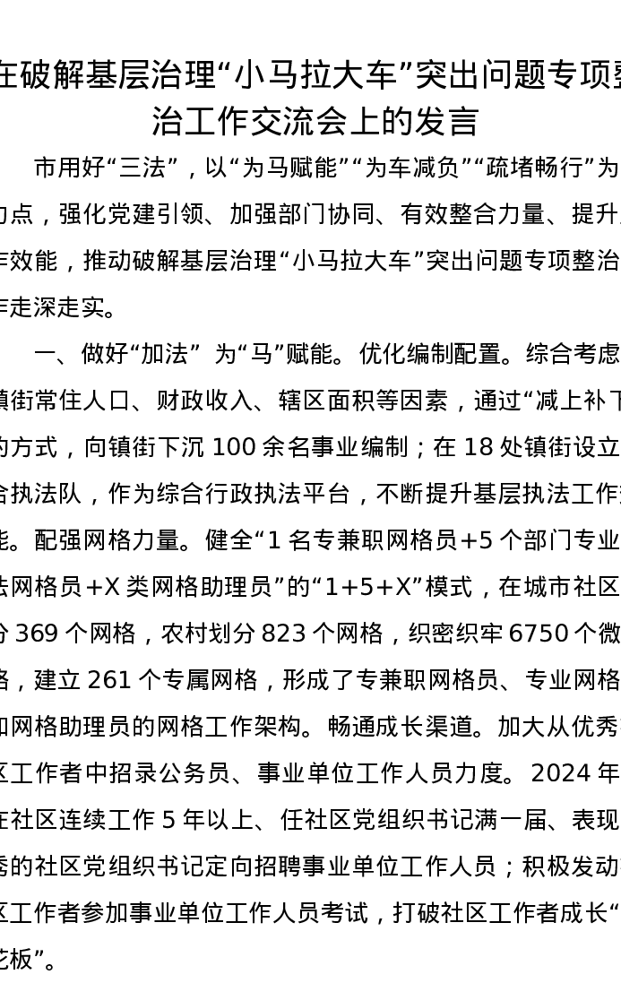 在破解基层治理“小马拉大车”突出问题专项整治工作交流会上的发言