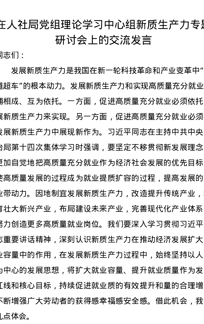 在人社局党组理论学习中心组新质生产力专题研讨会上的交流发言