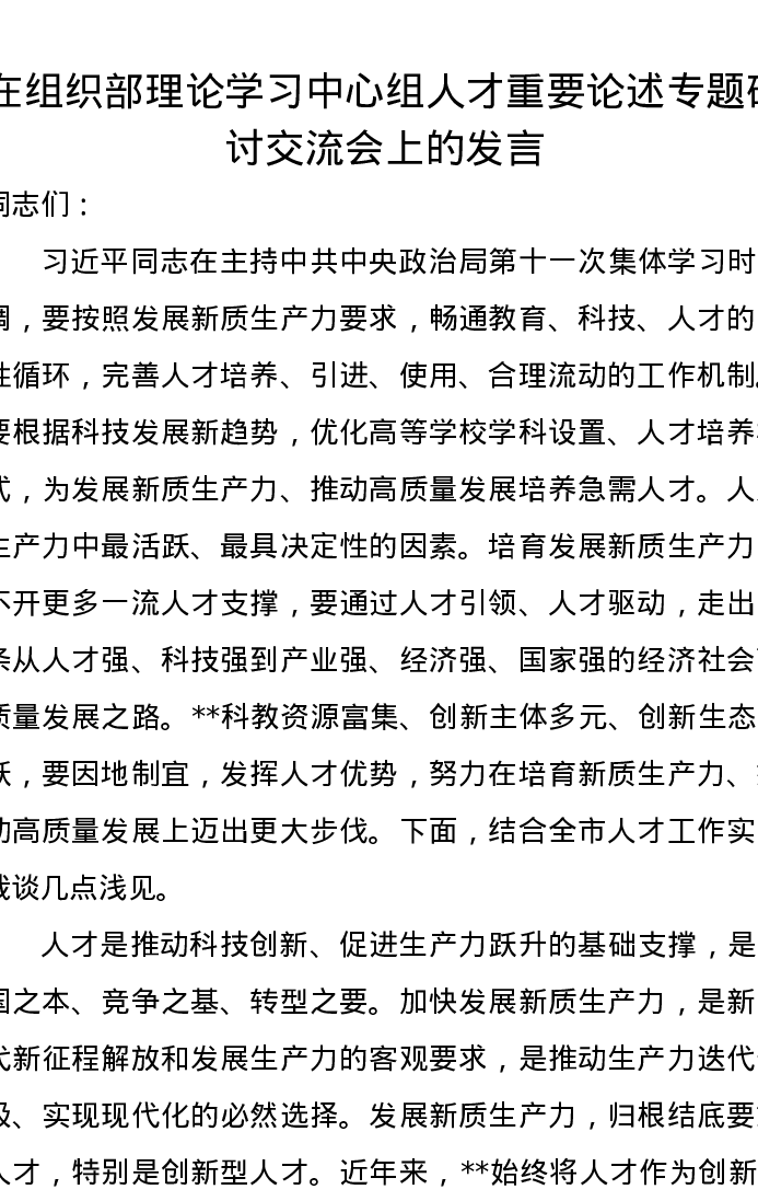 在组织部理论学习中心组人才重要论述专题研讨交流会上的发言