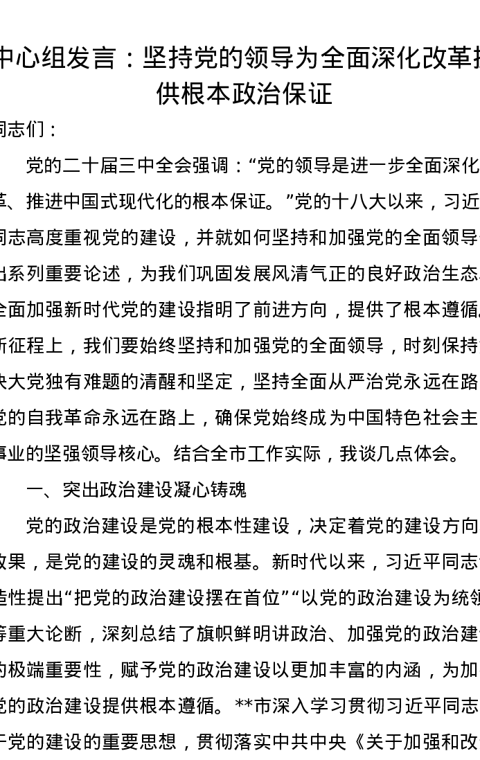 中心组发言:坚持党的领导为全面深化改革提供根本政治保证