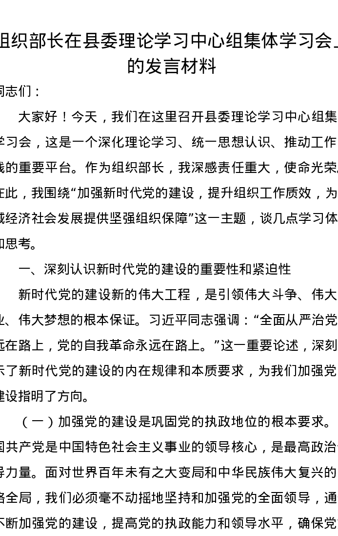 组织部长在县委理论学习中心组集体学习会上的发言材料