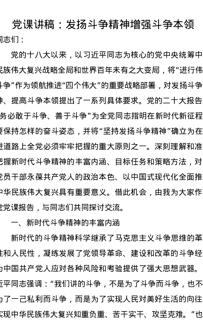 党课讲稿:发扬斗争精神增强斗争本领