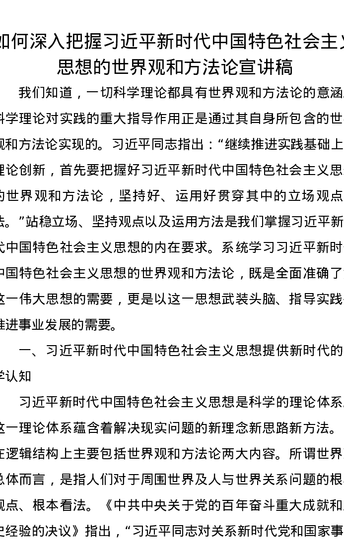 如何深入把握习近平新时代中国特色社会主义思想的世界观和方法论宣讲稿