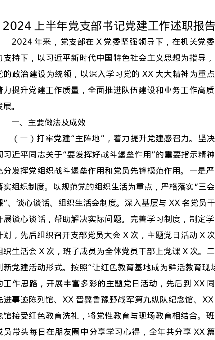 2024上半年党支部书记党建工作述职报告