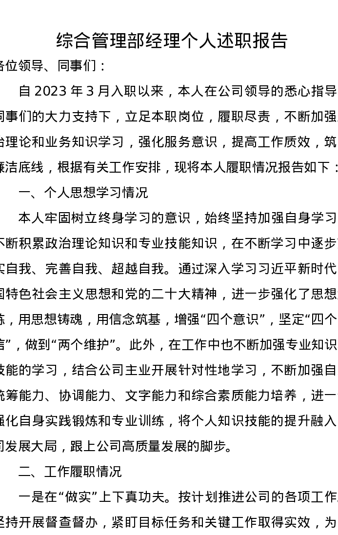 综合管理部经理个人述职报告