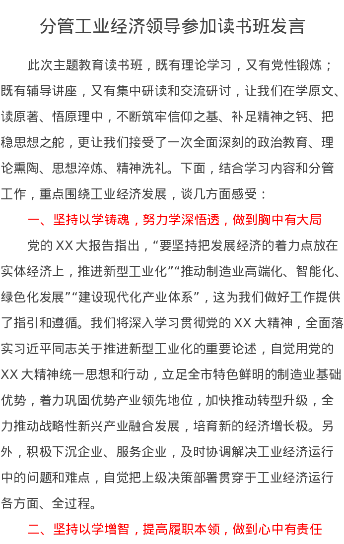 分管工业经济领导参加读书班发言